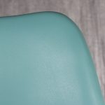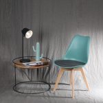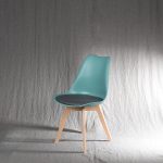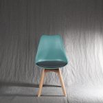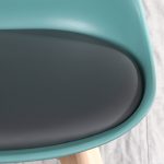 Silla con patas de madera, el asiento y respaldo son de polipropileno en color gris y asiento con relleno forrado en cuero PU petróleo oscuro