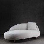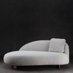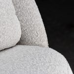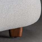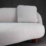 Sofá de bouclé crudo con relleno de espuma de alta densidad y estructura de madera de fresno americano.