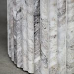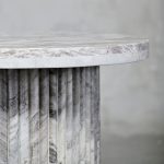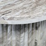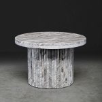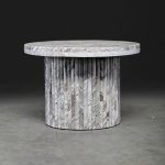 Mesa de centro de mármol carrara pulido. La base está construida con pequeñas piezas cilíndricas y la cubierta está hecha con una terminación lisa y pulida.