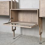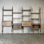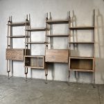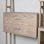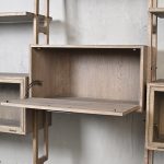 Materialidad: Estantería que se instala en a la pared, estructurada en roble rojo con enchape de roble en terminación gris. Los detalles como manillas y fijaciones son de fierro y, dos puertas son de vidrio.