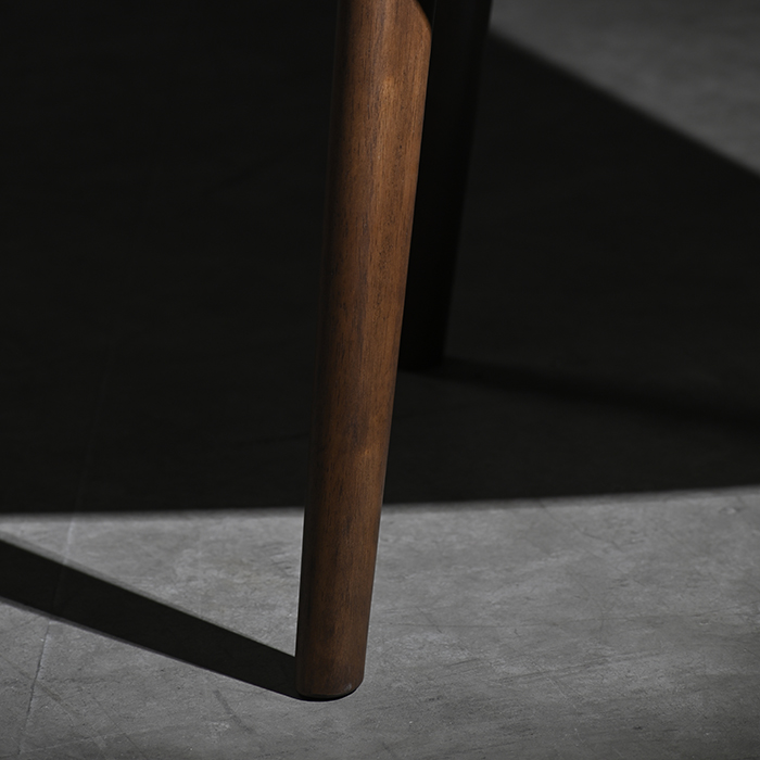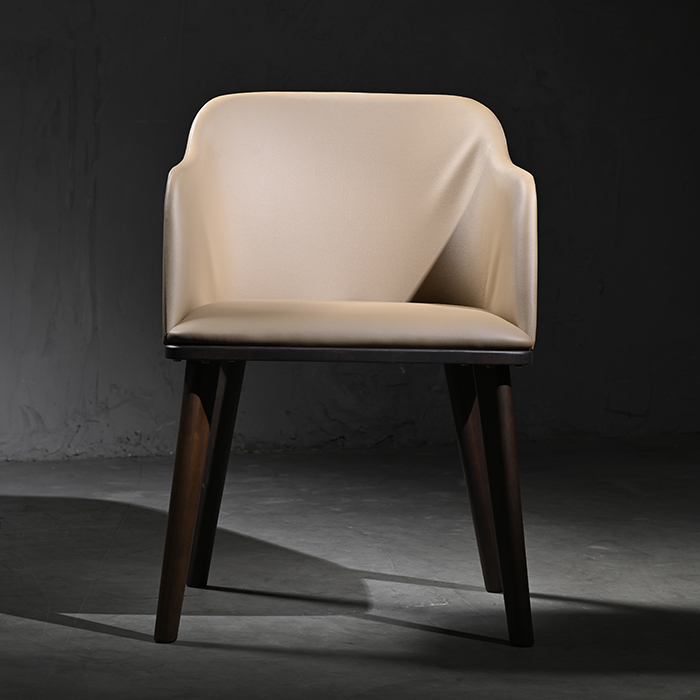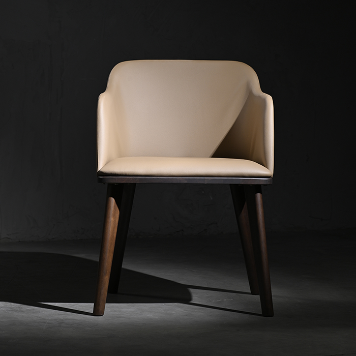 Silla de cuerina camel con madera de gomero en terminación nogal.