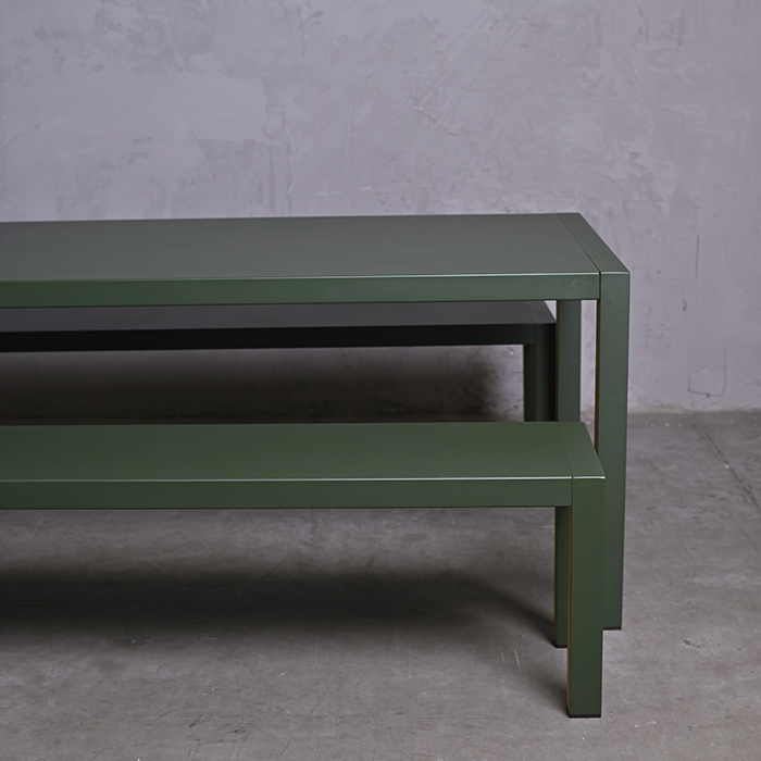 Mesa con estructura de aluminio en color verde y detalles en madera de teca en terminación gris.