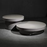 Conjunto de mesas de centro de aluminio con cubierta de frosted glass en terminación taupe.