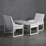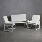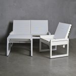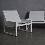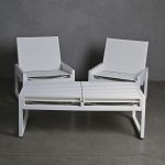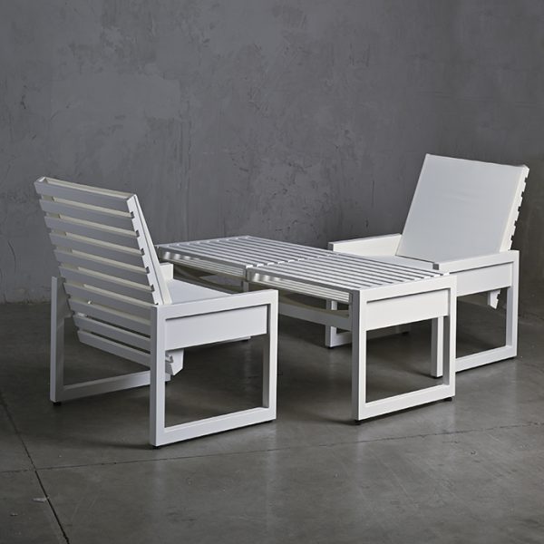 Conjunto de terraza conformado por un sofá mas dos sitiales, ambos cuentan con respaldos reclinables que permite ser usados como mesas laterales o de centro. Están fabricados con una estructura de aluminio en terminación blanco y tela sunbrella blanco.