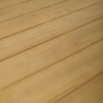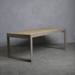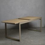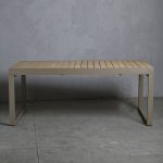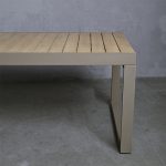 Mesa extensible de comedor con estructura de aluminio y madera de eucalipto en terminación grisácea.