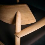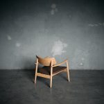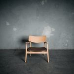 Poltrona fabricada en madera de Roble Americano en terminación natural y asiento de cuero natural en color taupe.