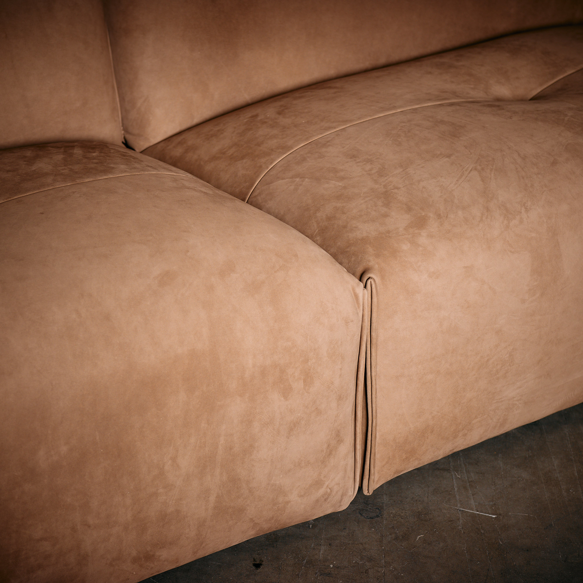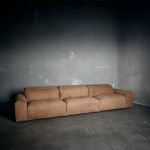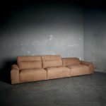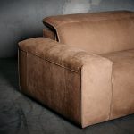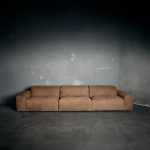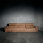 Sofá tapizado en cuero italiano natural en tono chocolate.