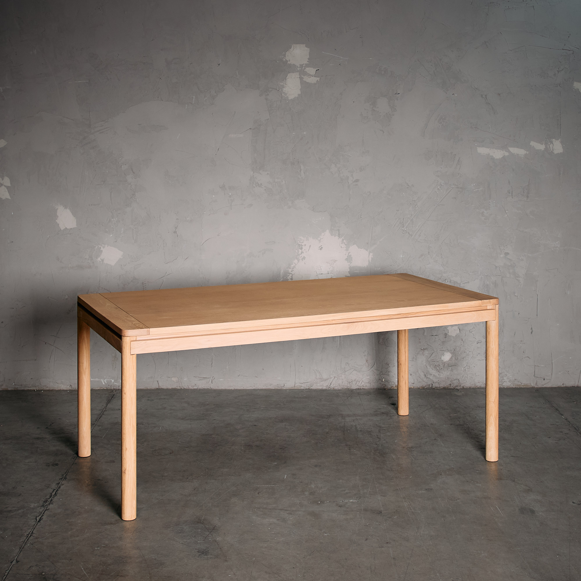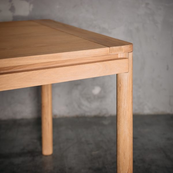 Esta mesa de comedor, fabricada en Madera de Roble con terminación en tono natural, resalta la belleza única de sus vetas y la calidez de la madera maciza.