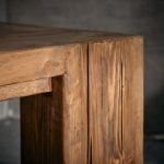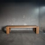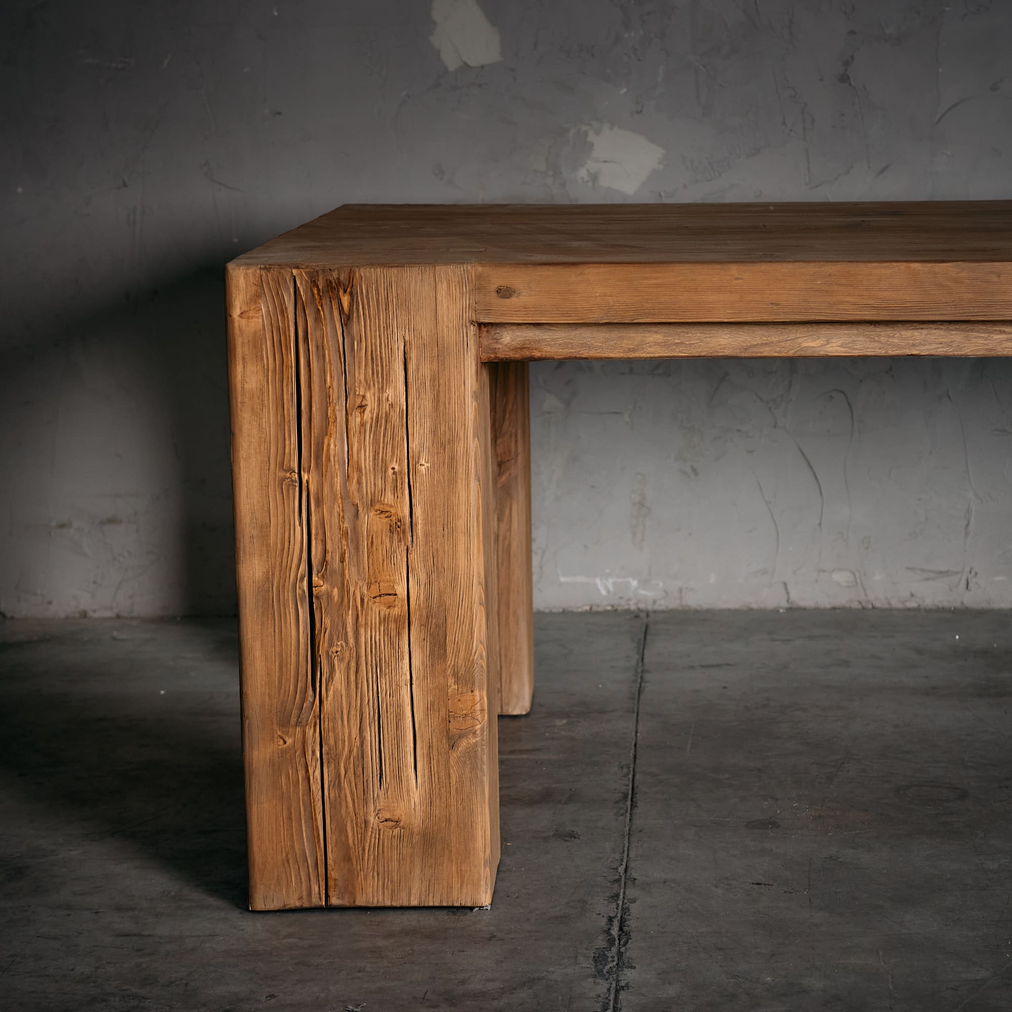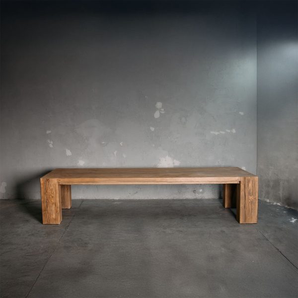 Mesa de comedor en madera maciza de olmo envejecido, donde cubierta y base se funden en una sola forma continua, resaltando la solidez y pureza del diseño. Una pieza de líneas esenciales que celebra la belleza del material y la atemporalidad del gesto constructivo.