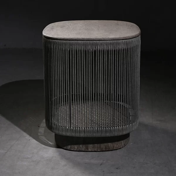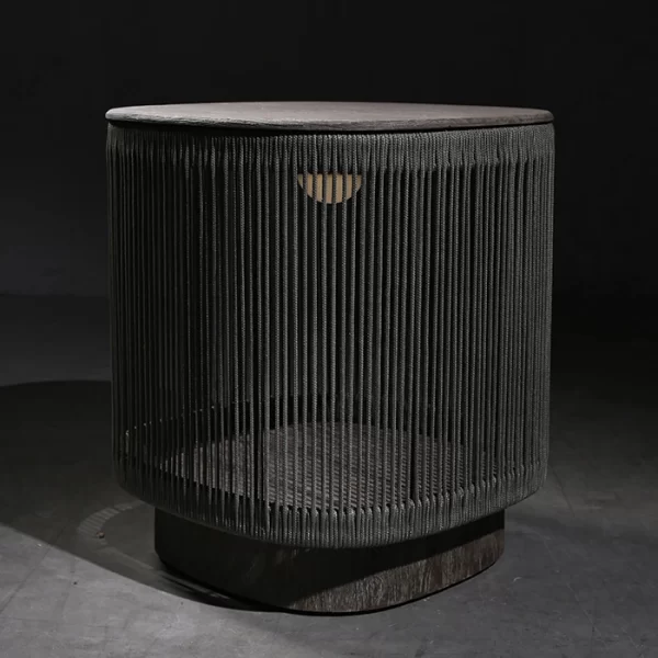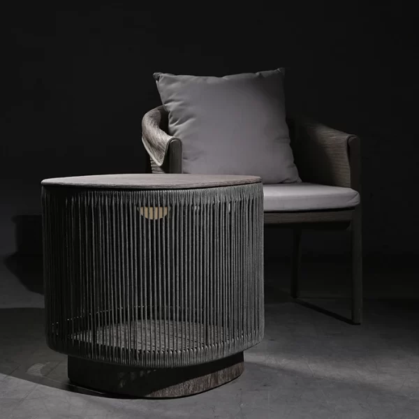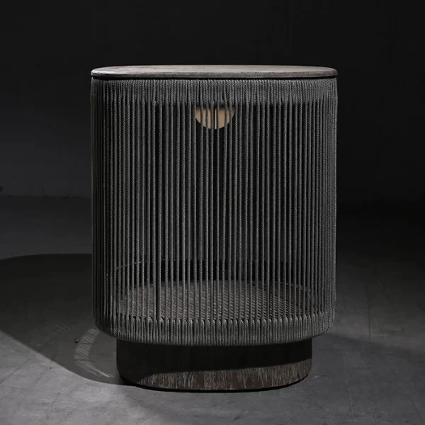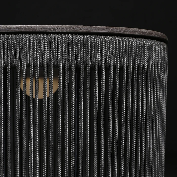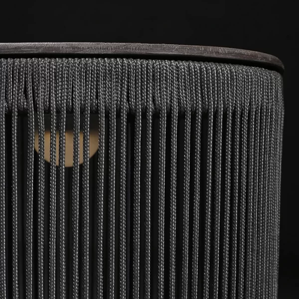 Lámpara y mesa de apoyo en una sola pieza de diseño funcional, elaborada en madera maciza de teca Grado A con terminación natural que resalta la nobleza y calidez del material. Su estructura en aluminio electropintado aporta resistencia y una estética contemporánea, complementada con cuerda tipo mimbre en polipropileno con protección UV que añade textura y un sutil guiño artesanal. Los detalles en acero inoxidable y los deslizadores en caucho PA garantizan estabilidad y durabilidad incluso en exteriores. Incorpora una luminaria con certificación IP65 CE/UL, ideal para espacios al aire libre, y un sistema de carga directa mediante puerto USB, que combina tecnología, comodidad y elegancia en una sola pieza versátil.