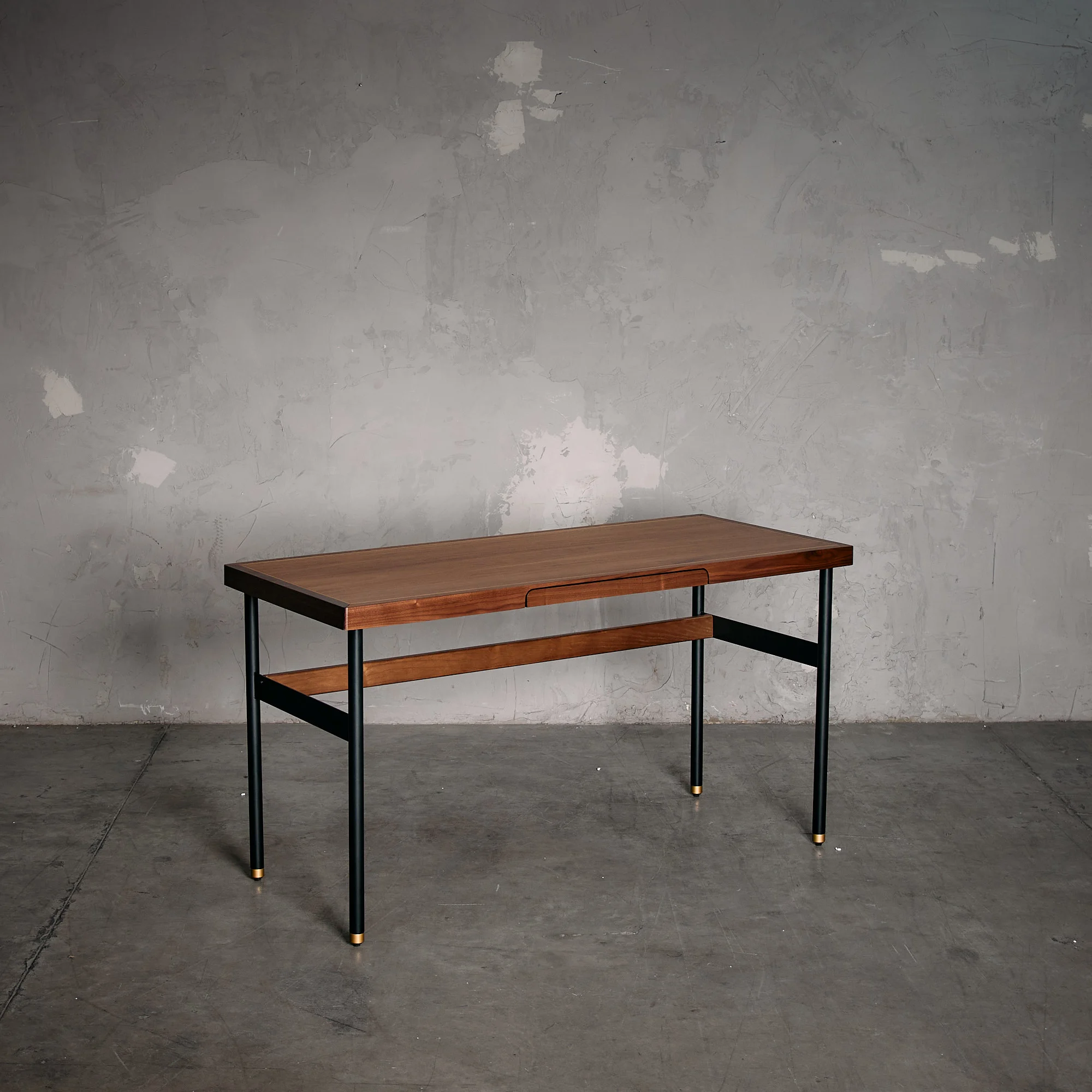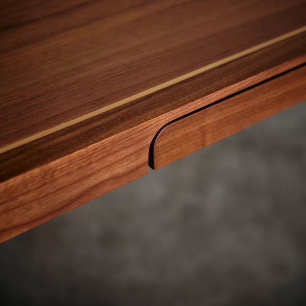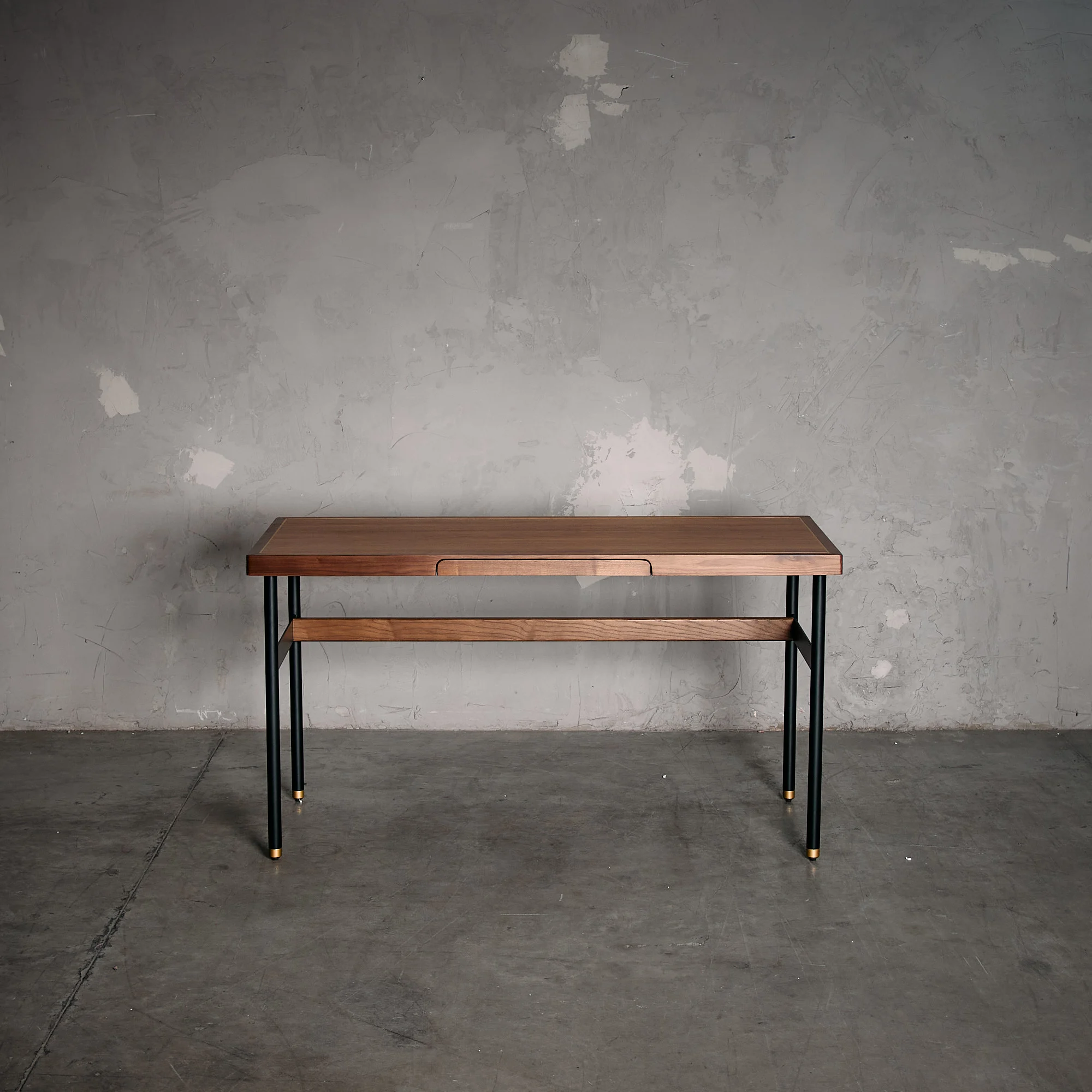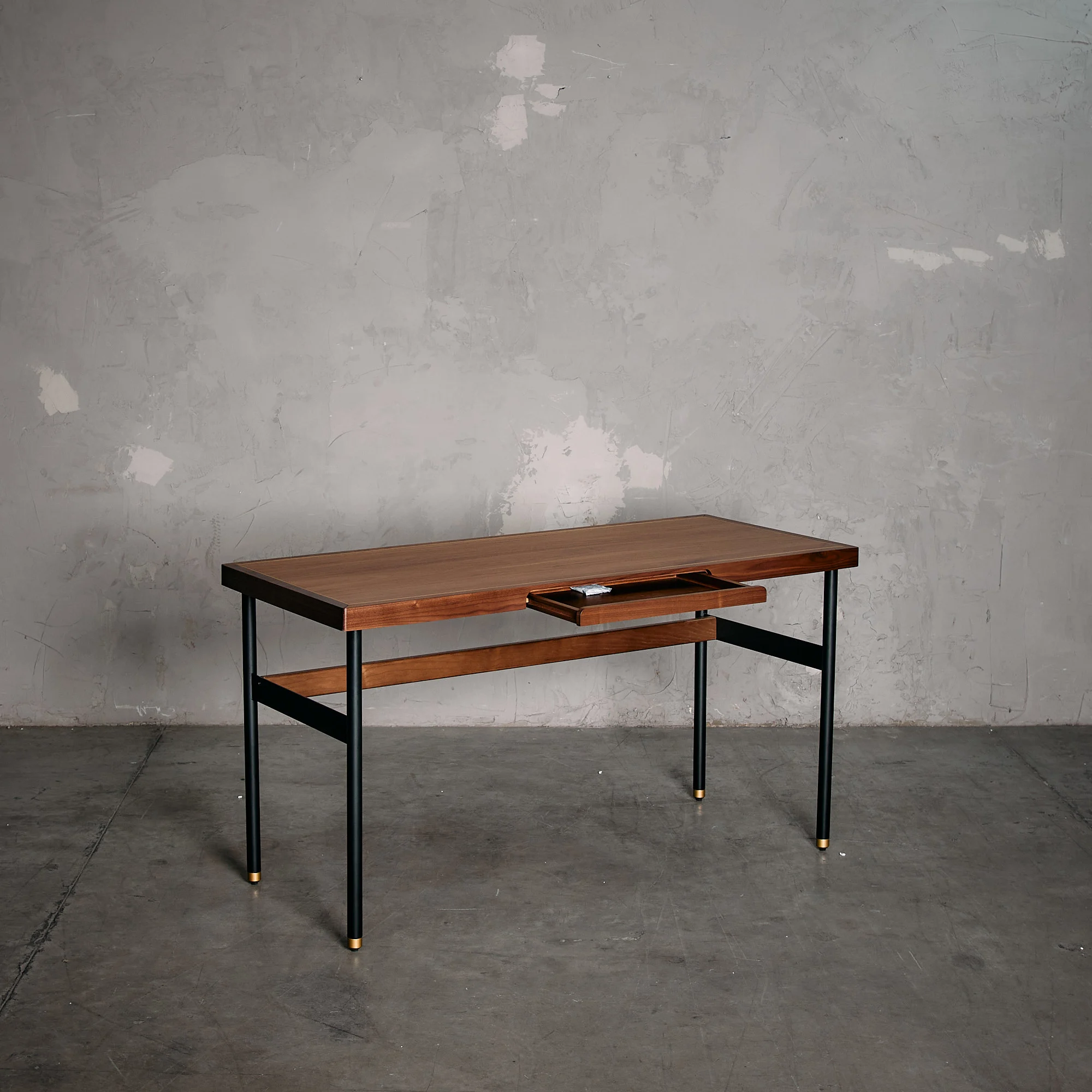Este escritorio fabricado en enchape de Madera de Roble  combina la calidez de la madera en color nogal con la solidez de una estructura de fierro con terminaciones en bronce en la cubierta, ofreciendo un diseño moderno, resistente y funcional.