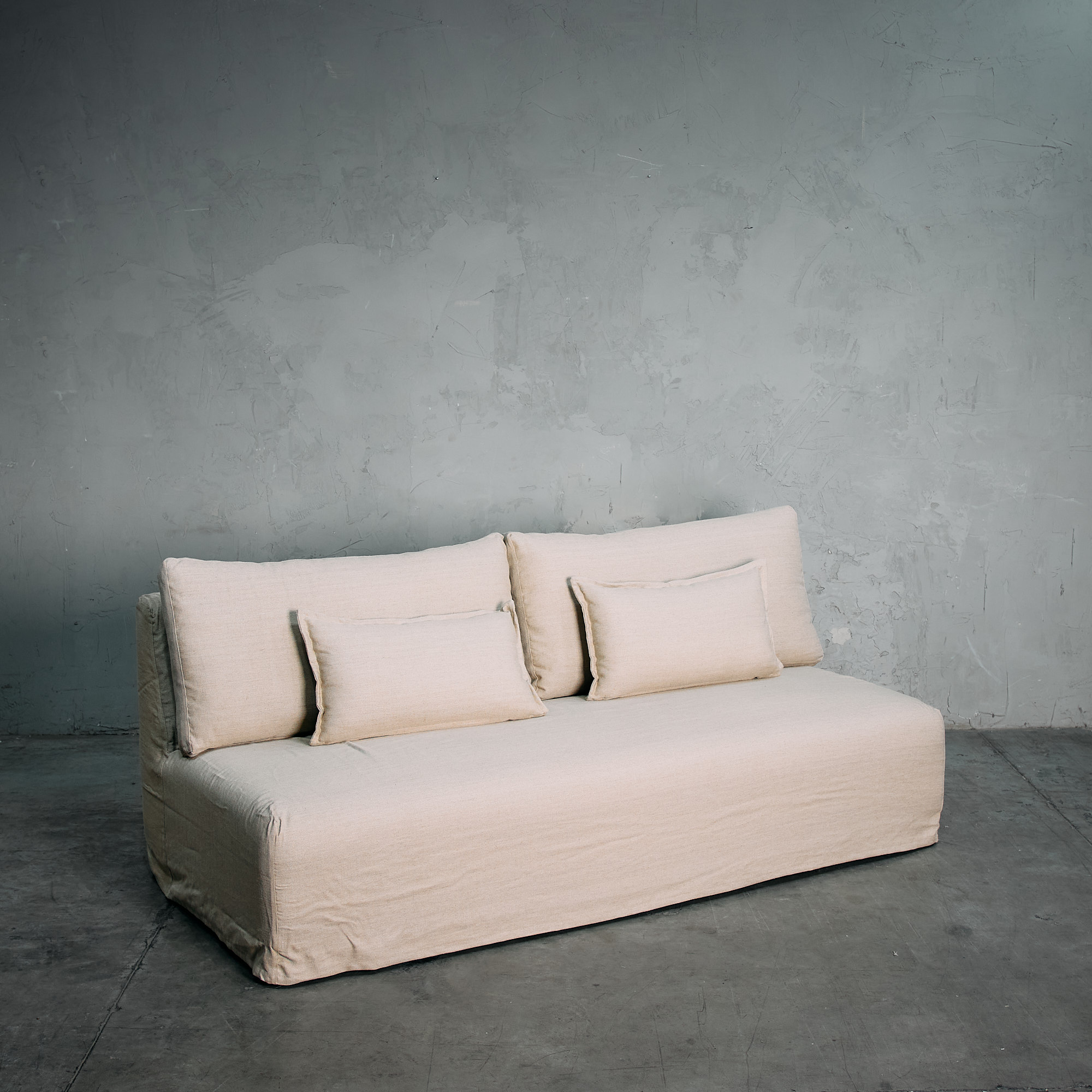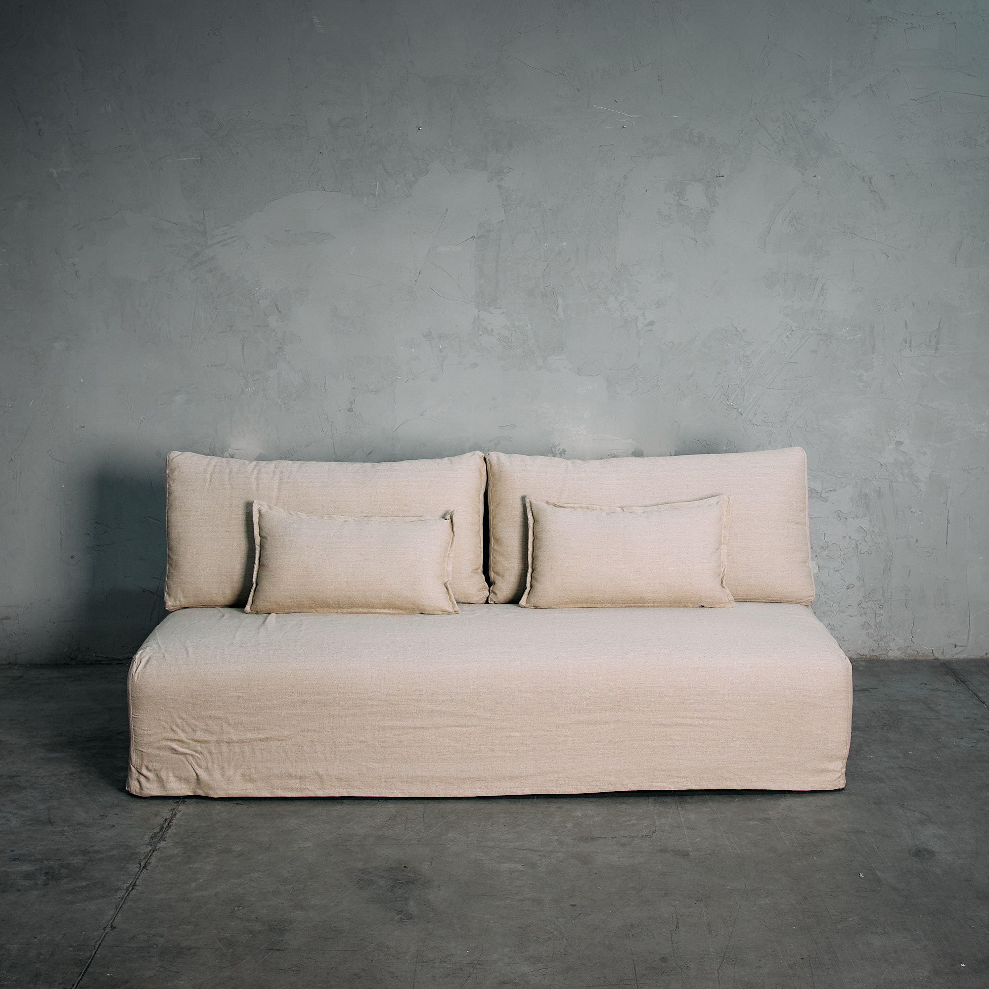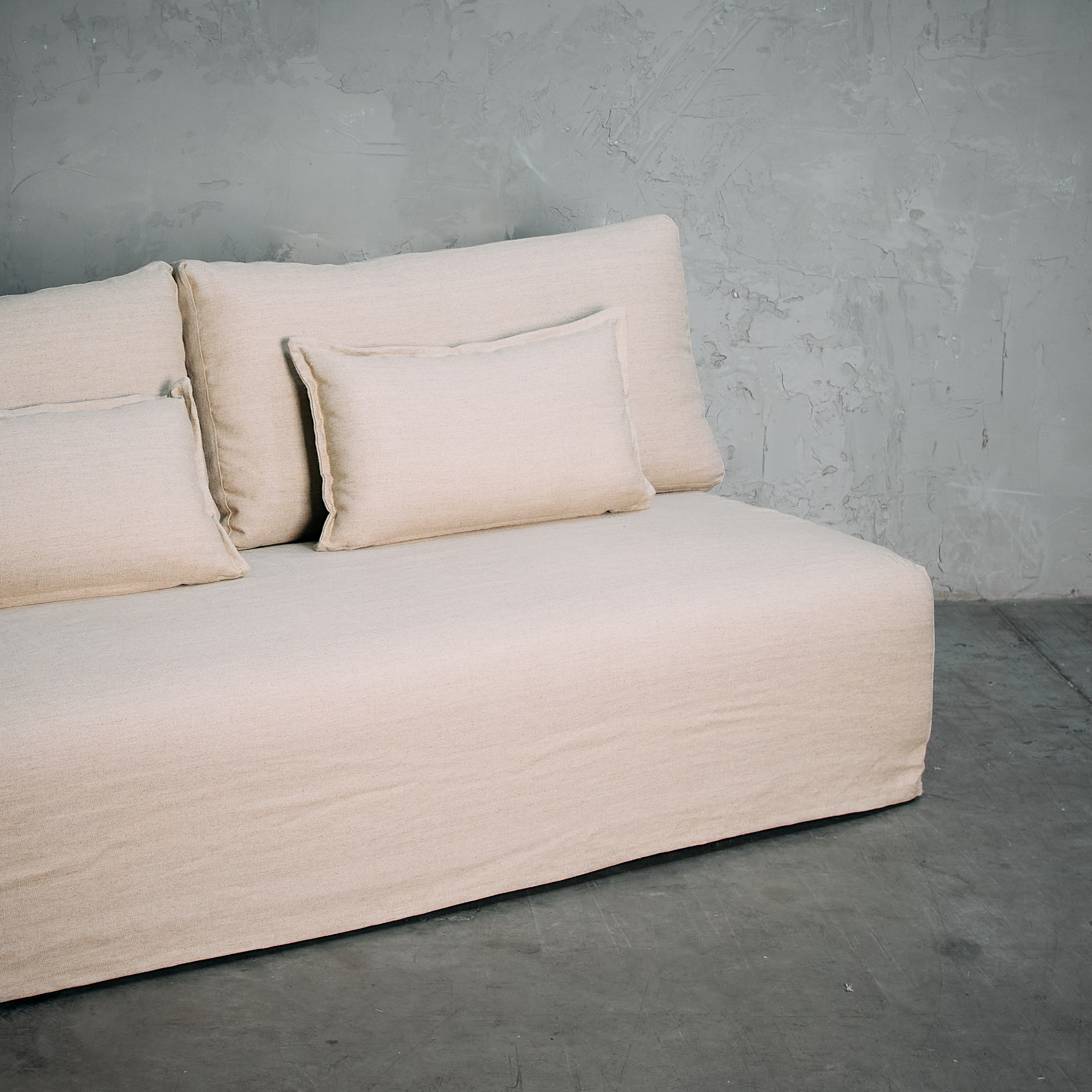 Sofá tapizado en lino legiado, con asiento de espuma de alta densidad que combina comodidad y diseño en una pieza minimalista y elegante.