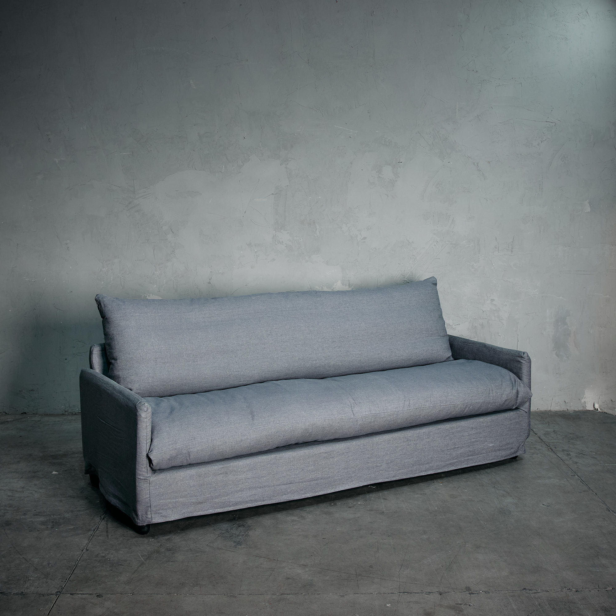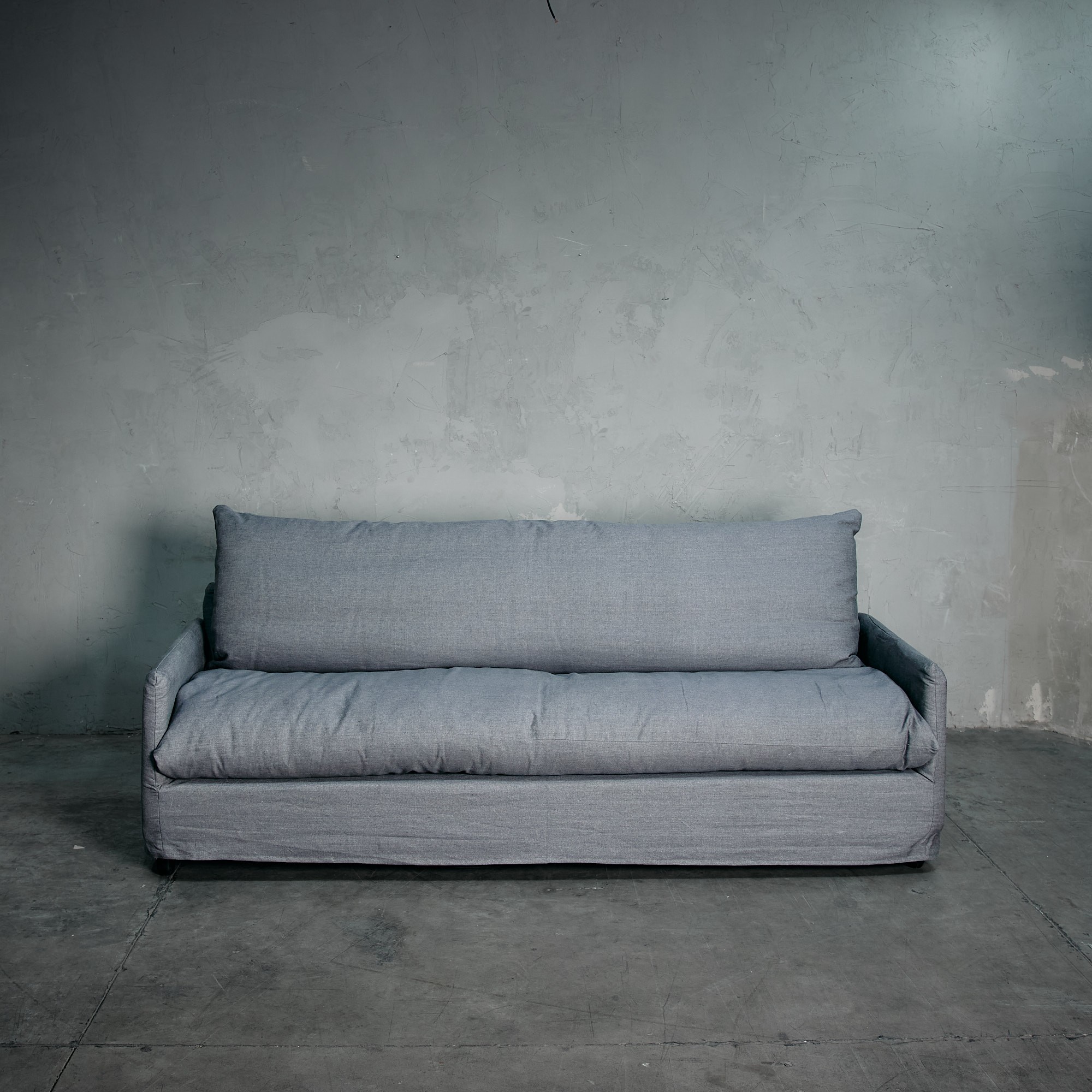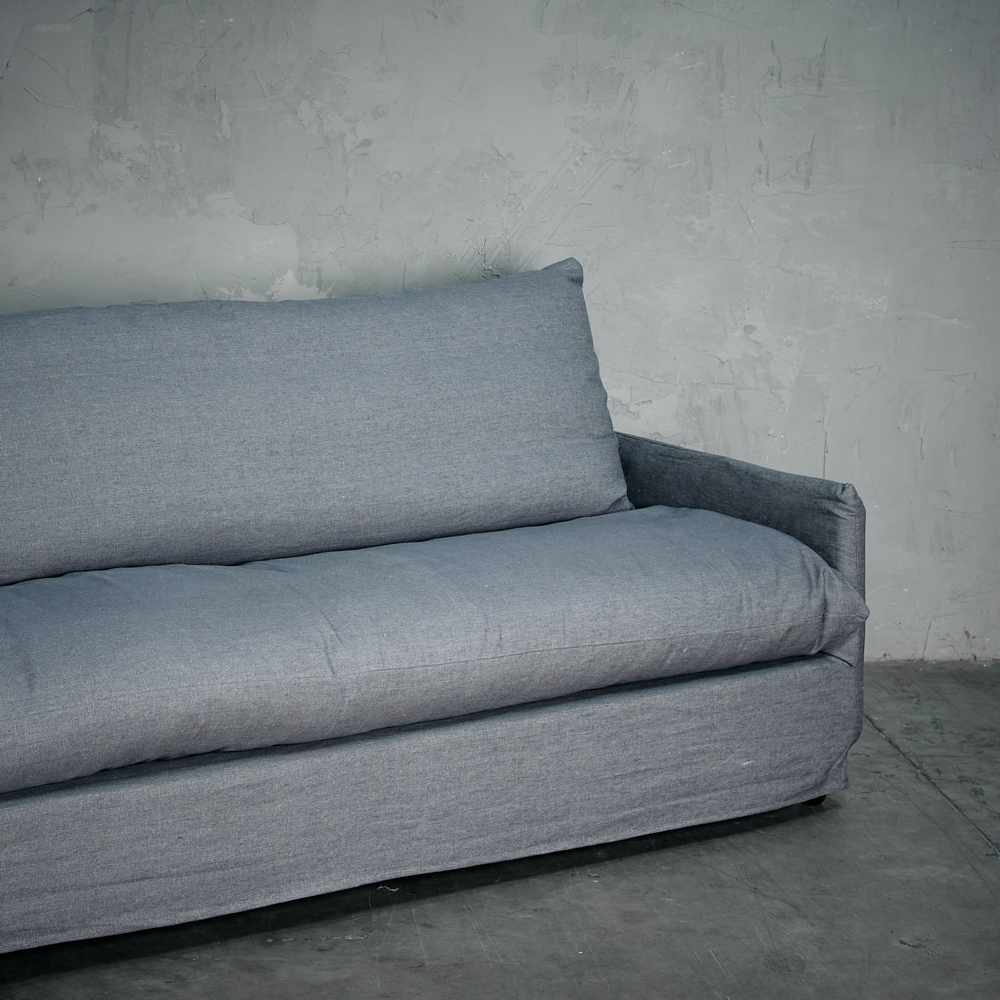 Tela lino gris, asiento espuma de alta densidad y pluma, cojines hollofil y plumas