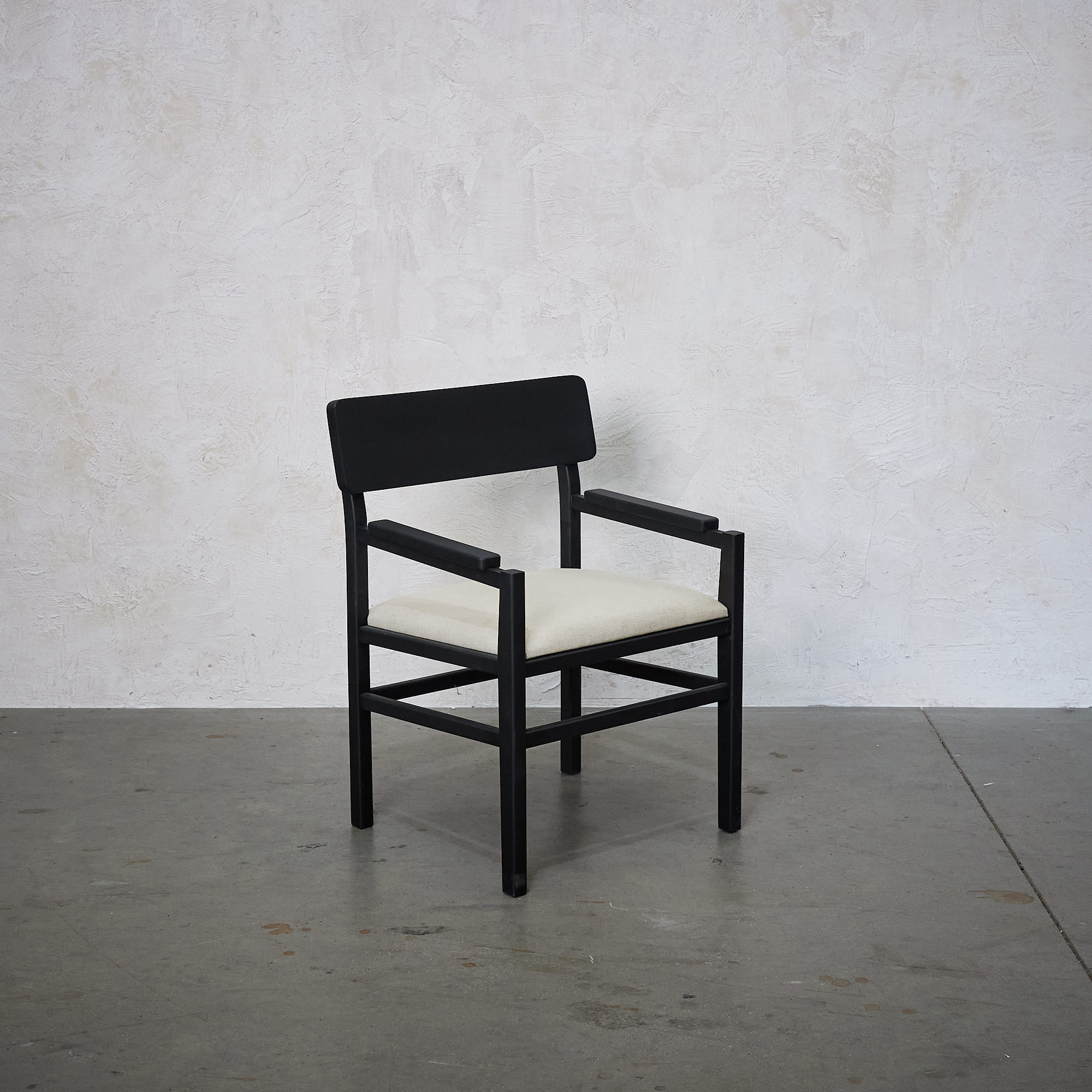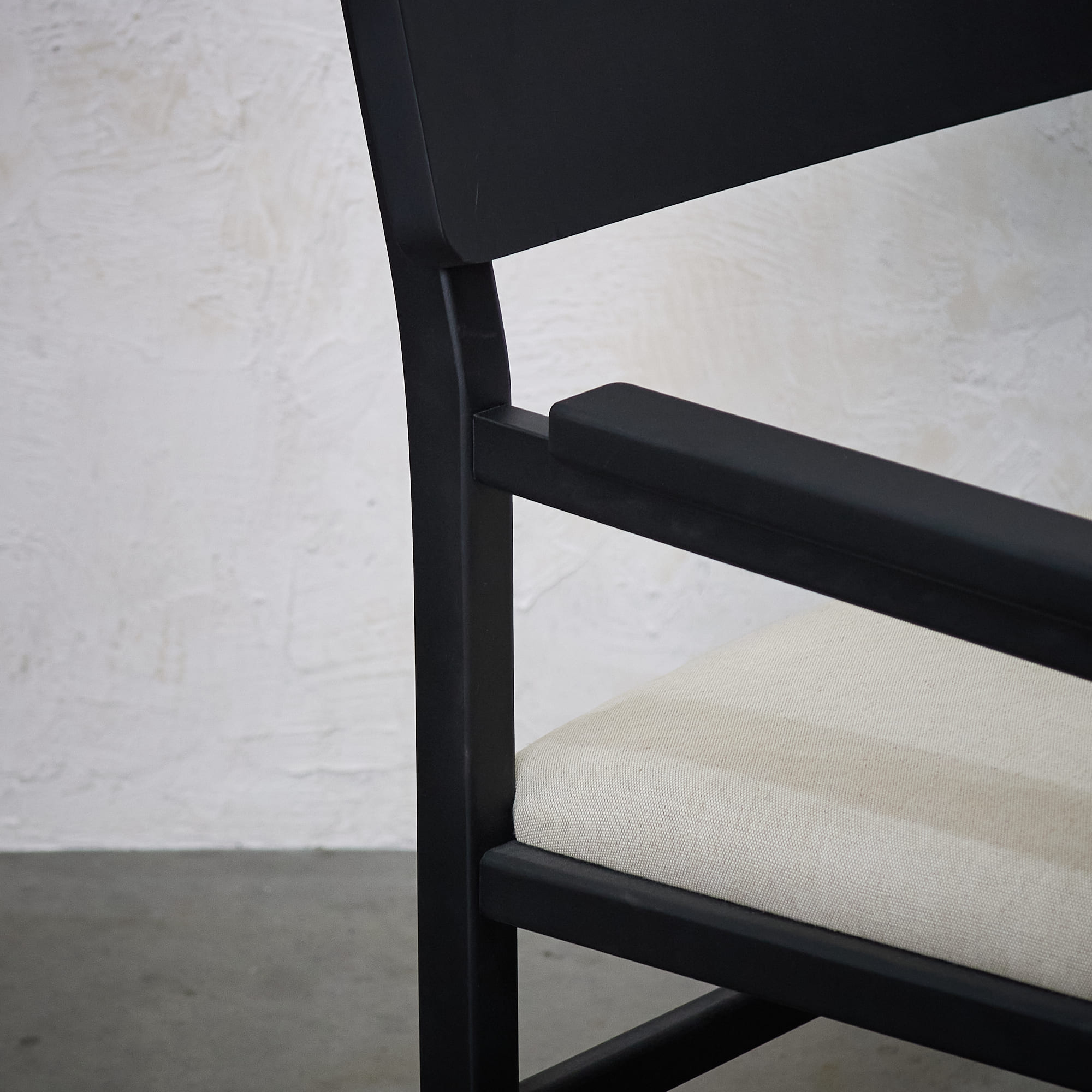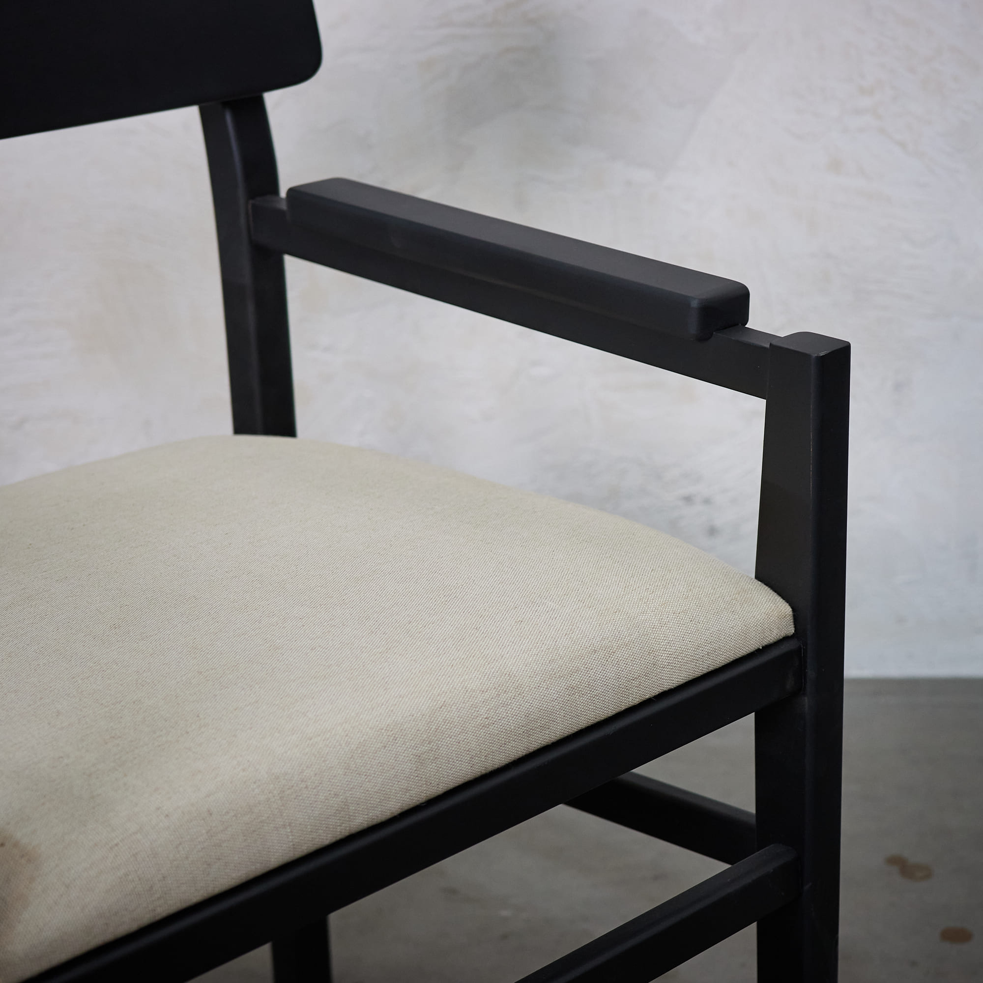 Poltrona fabricada en madera de lenga con terminación en tono negar y asiento tapizado en tela color almendra
