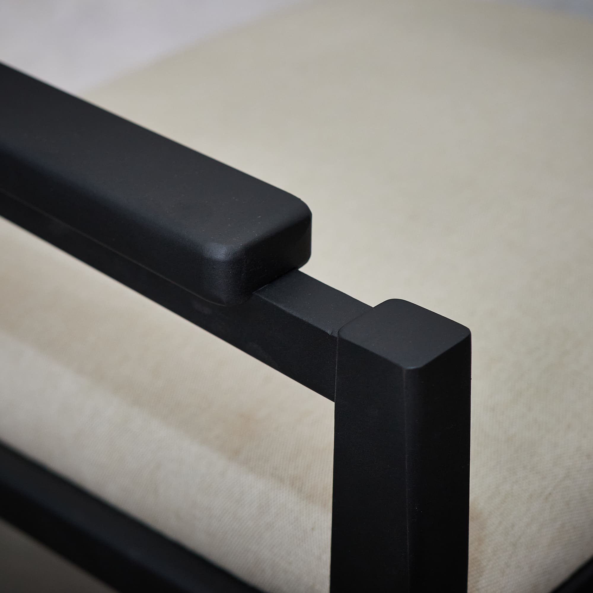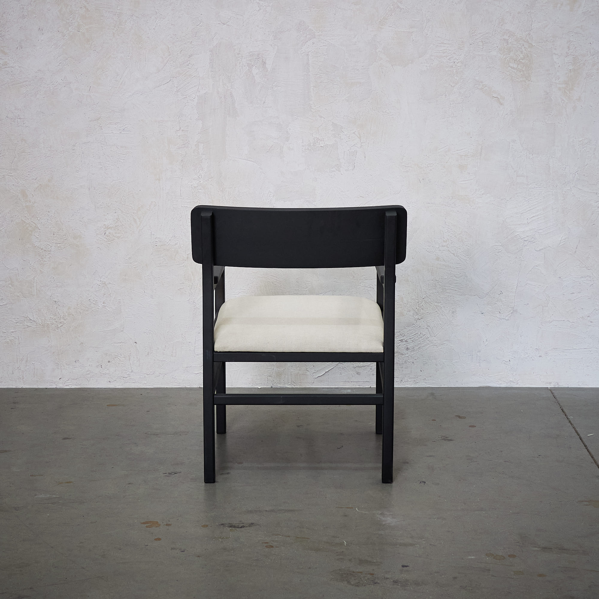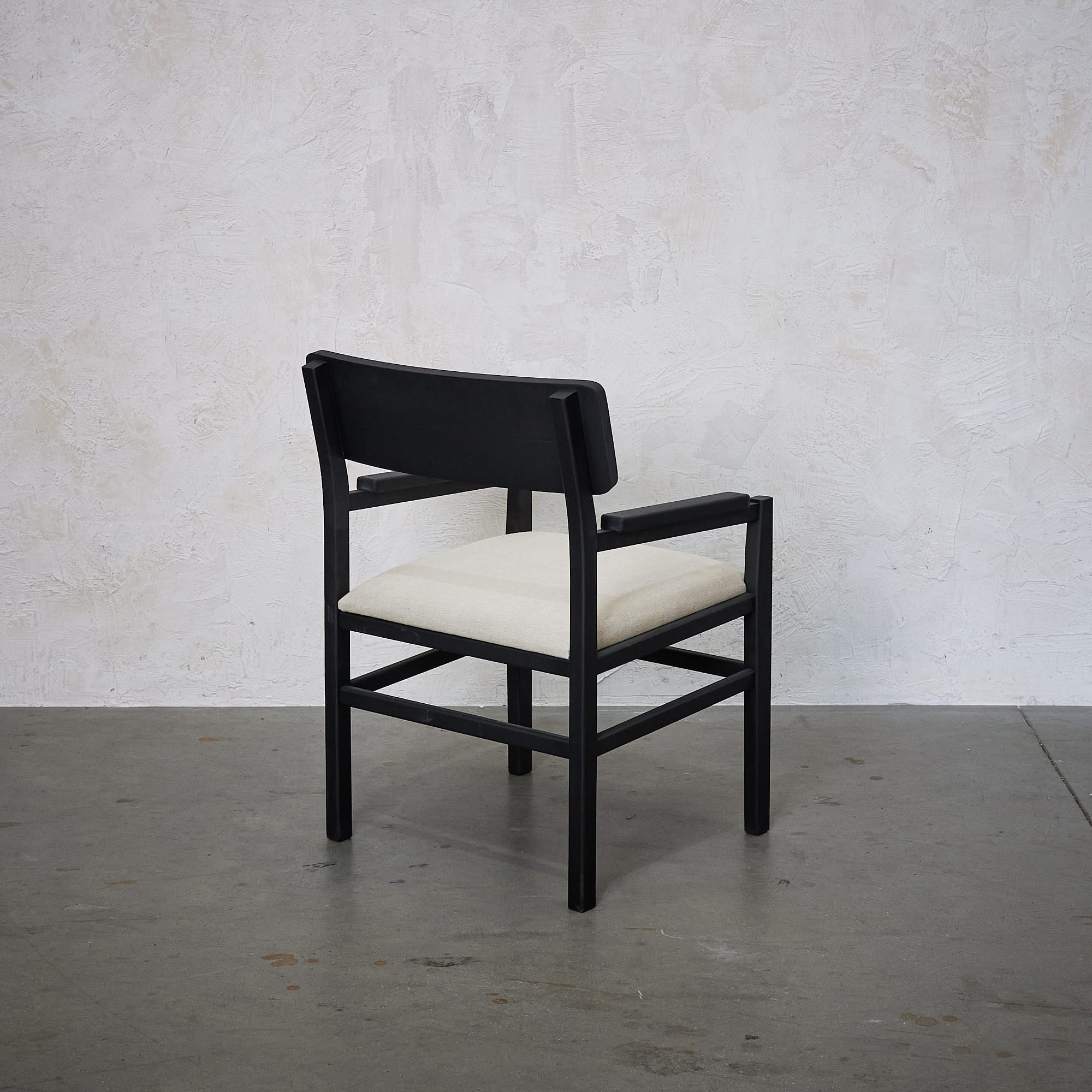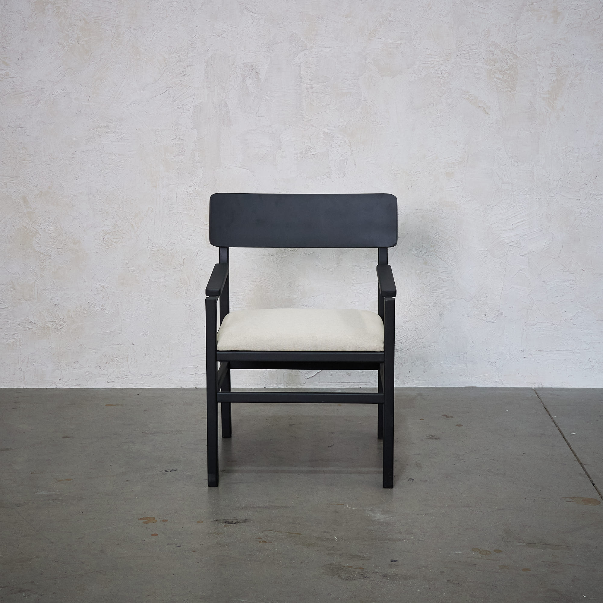 Poltrona fabricada en madera de lenga con terminación en tono negar y asiento tapizado en tela color almendra