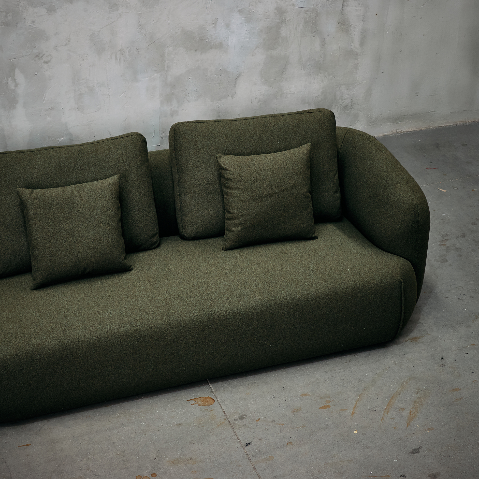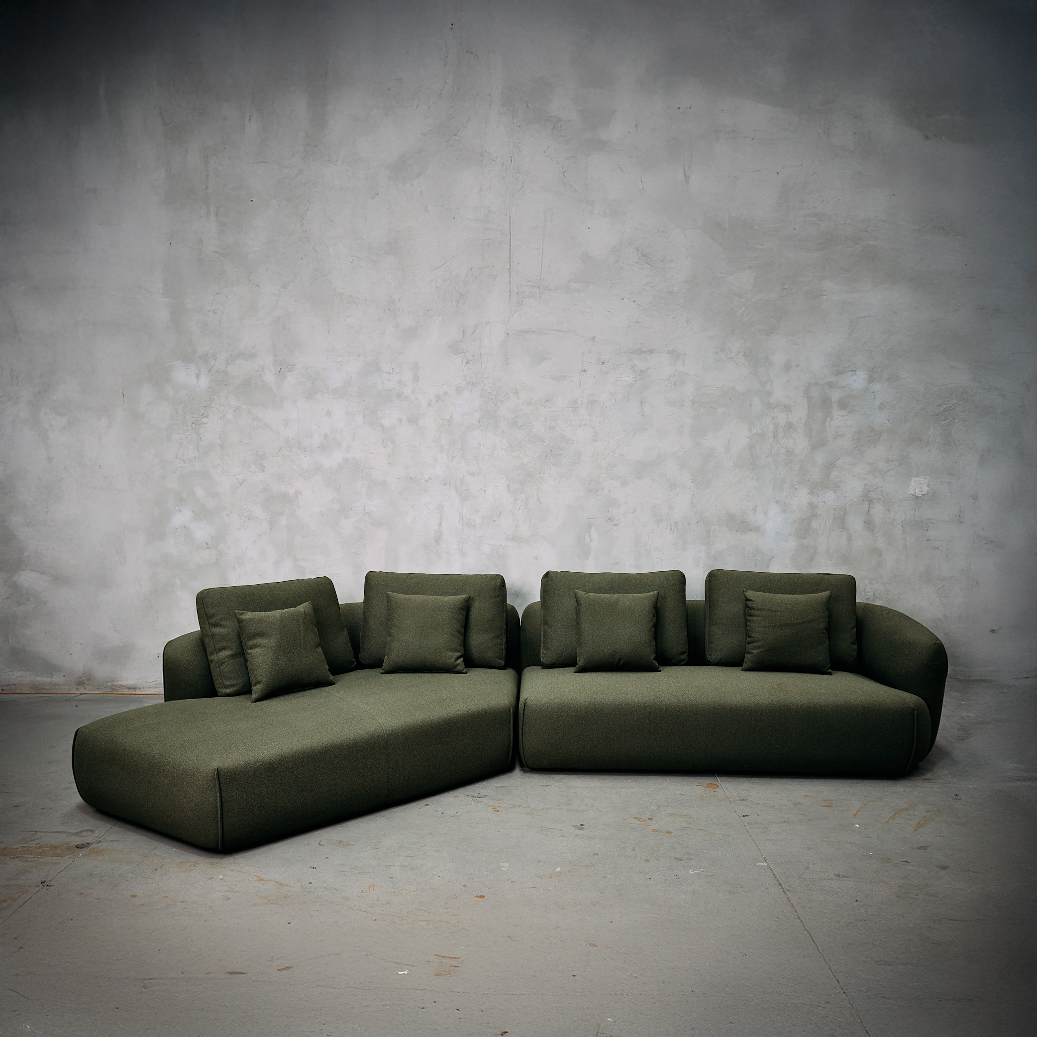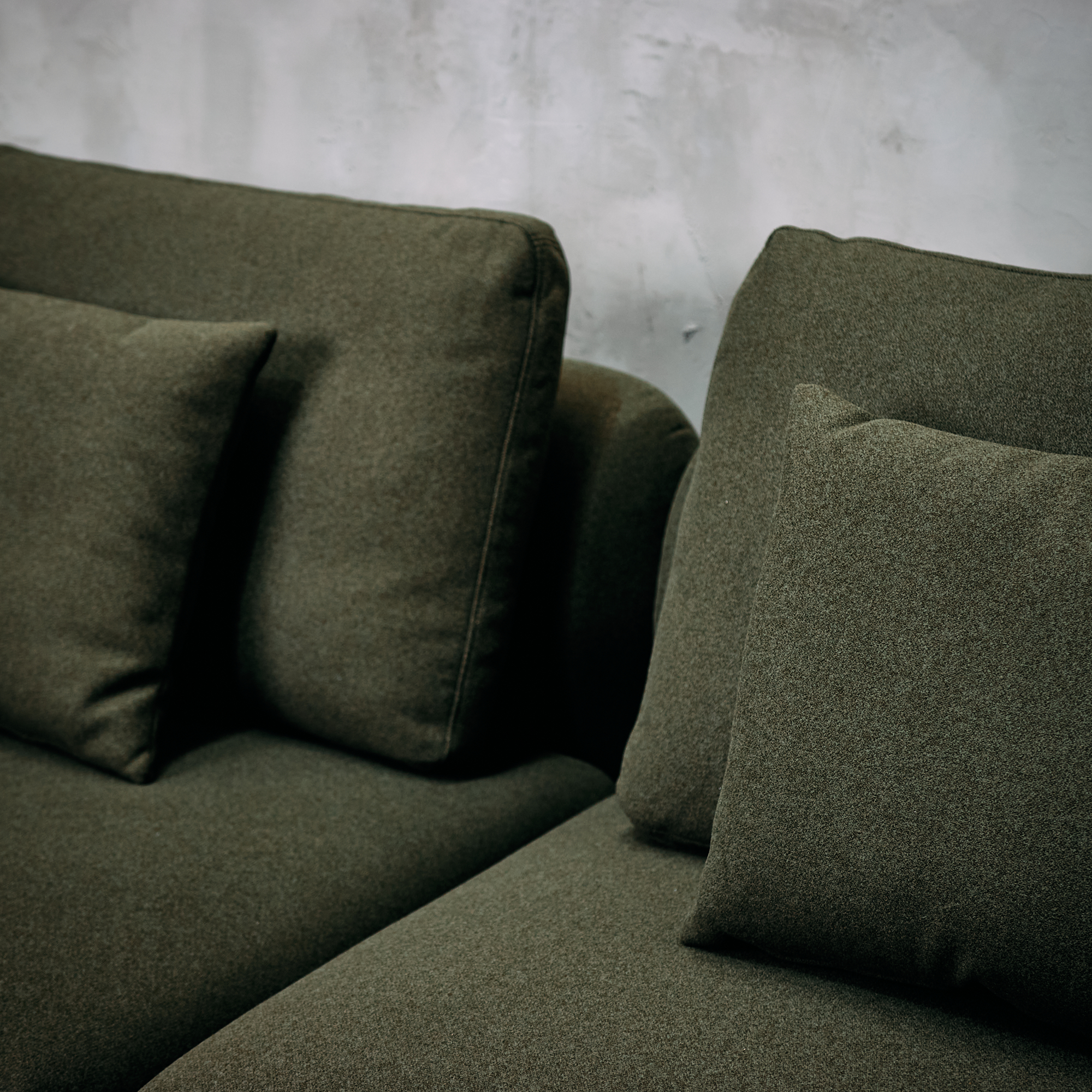 Sofá seccional tapizado en tela tipo lana verde.