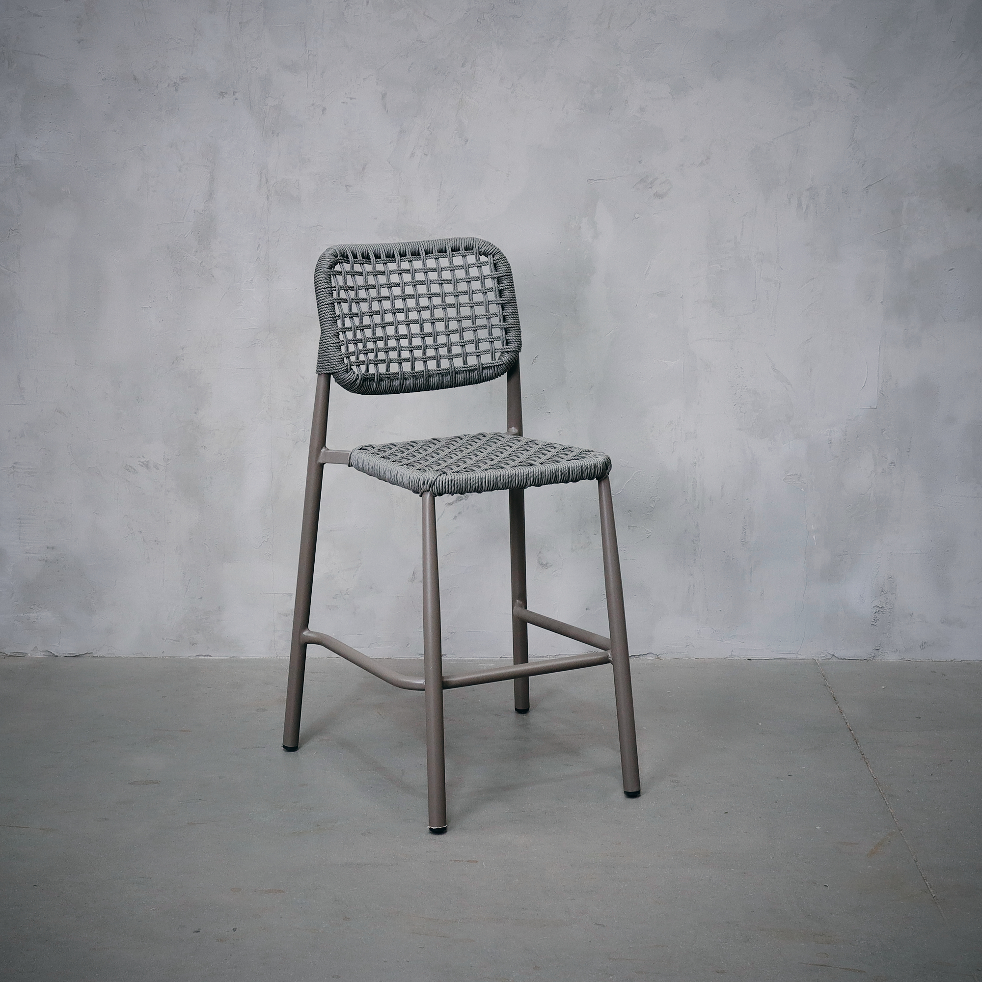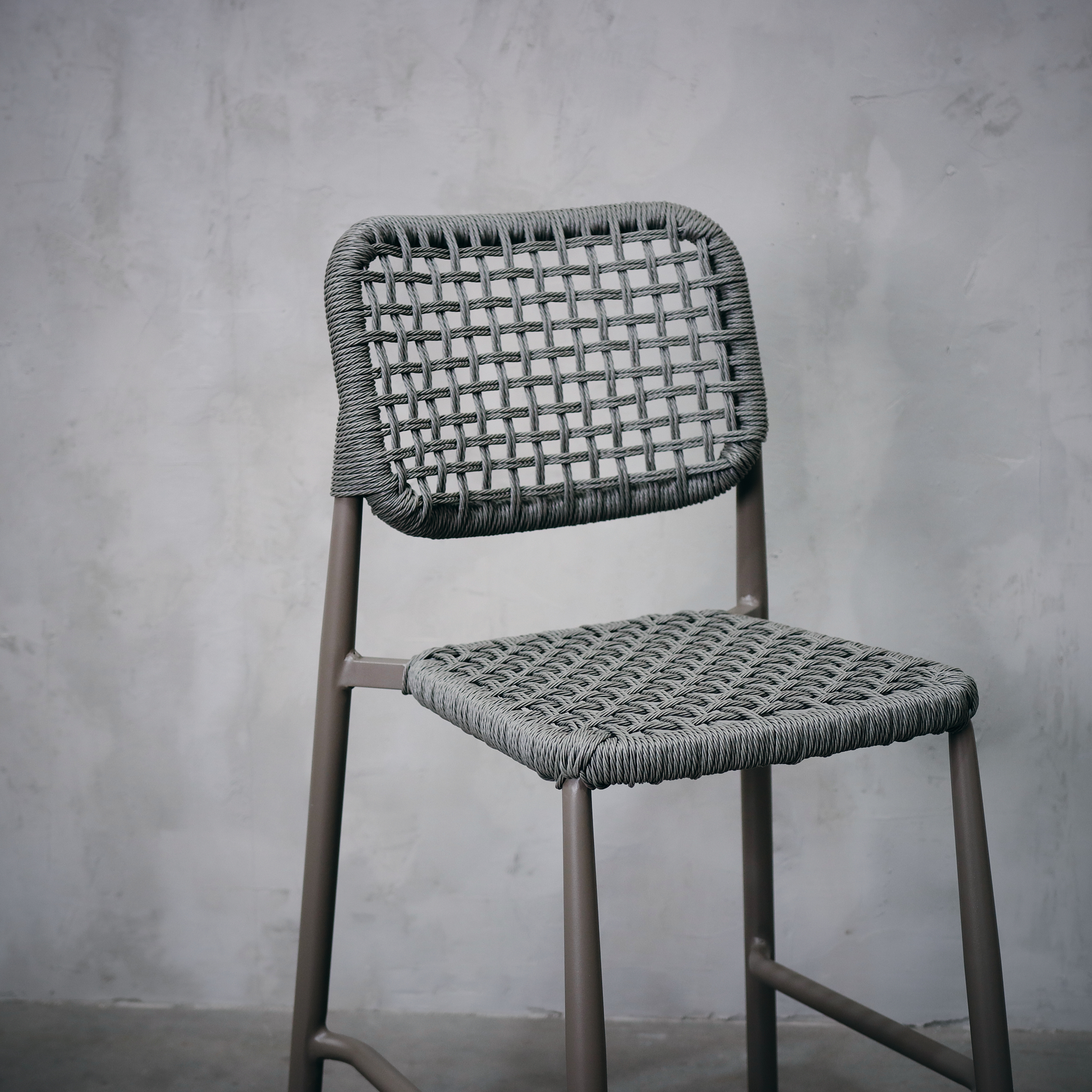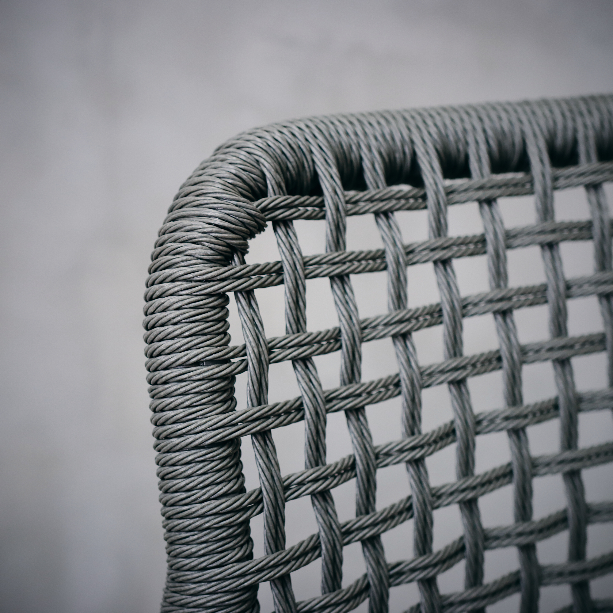 Piso elaborado con una estructura de aluminio y cuerda náutica en color taupe. Este material destaca por ser muy resistente y ligero. Entre sus principales ventajas se encuentra su excelente resistencia a la humedad, lo que lo hace perfecto para mobiliario tanto de interior como exterior.
