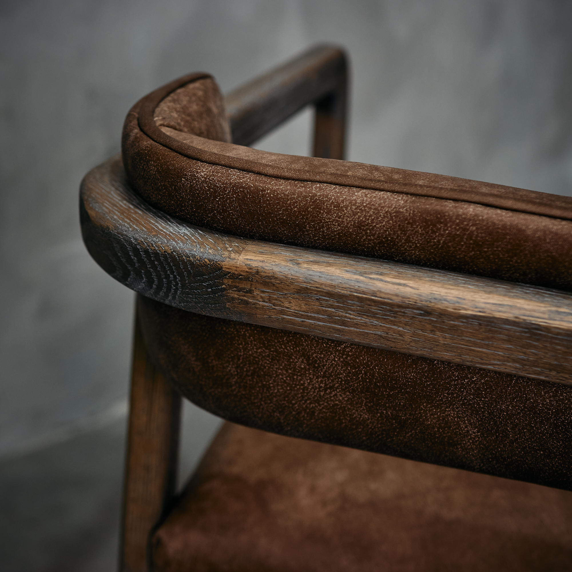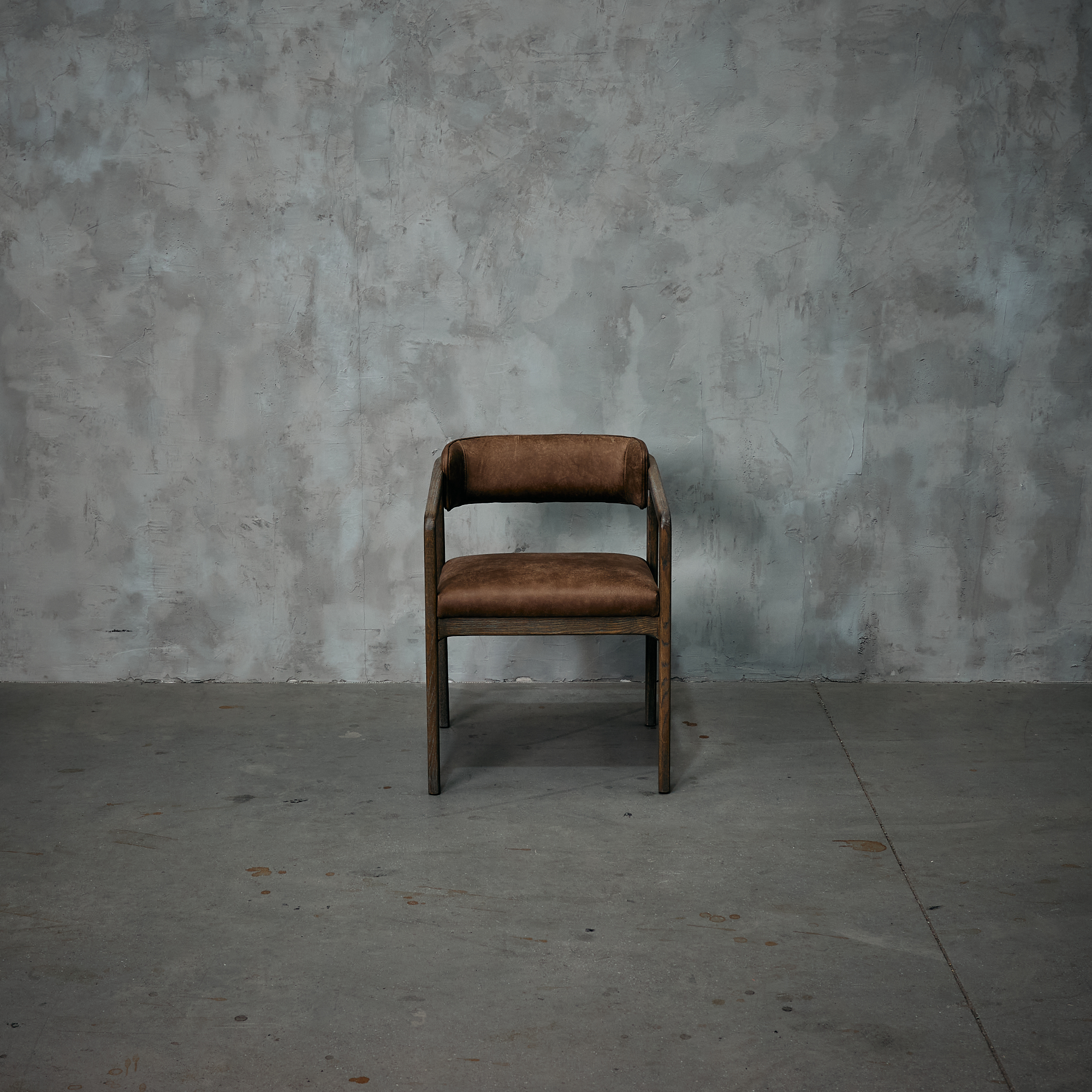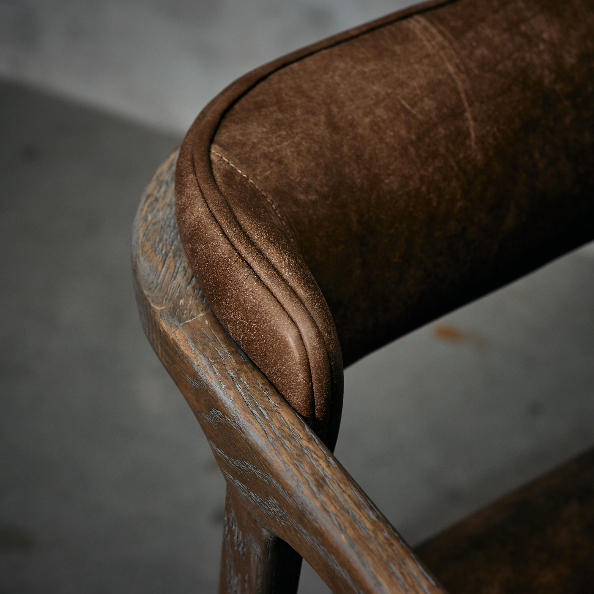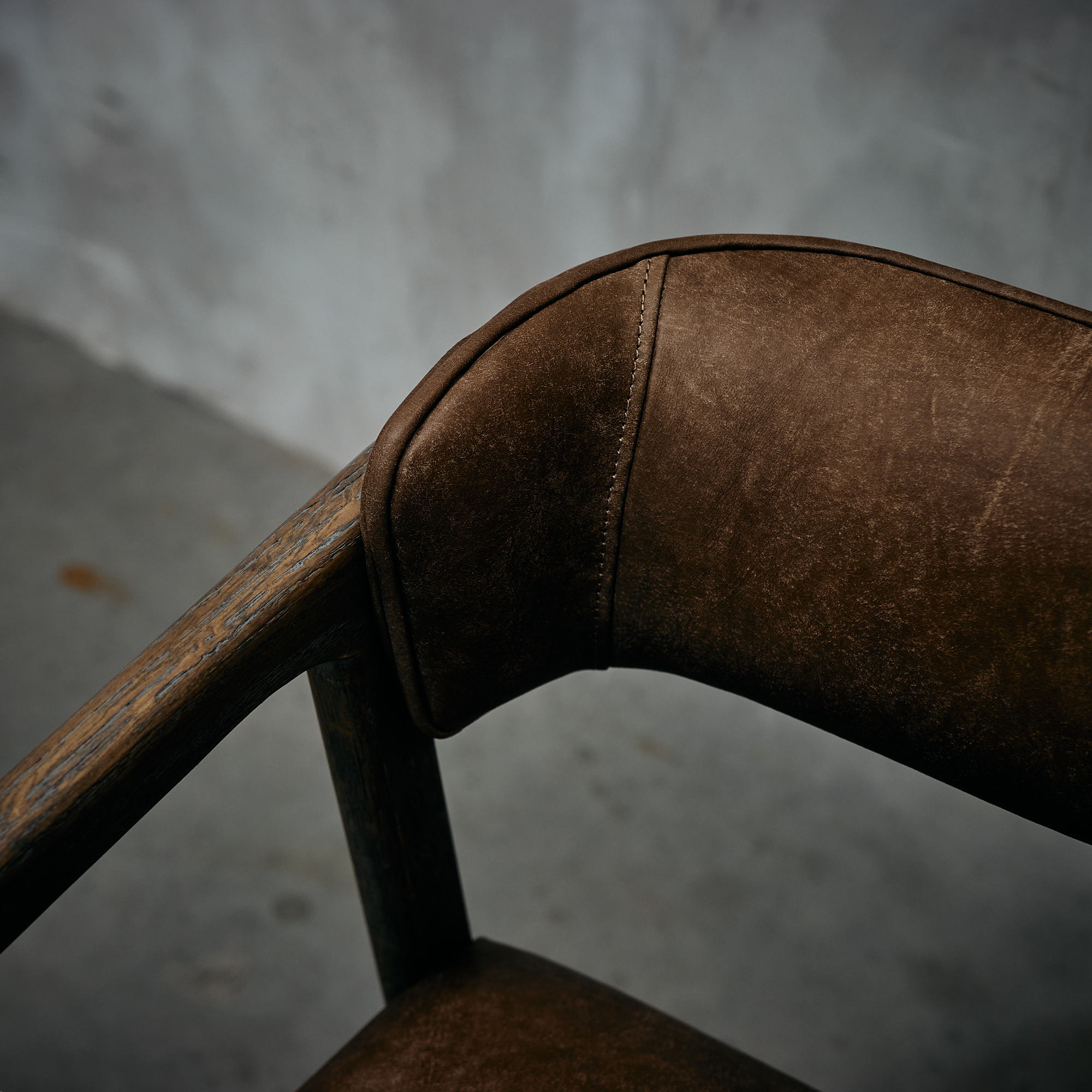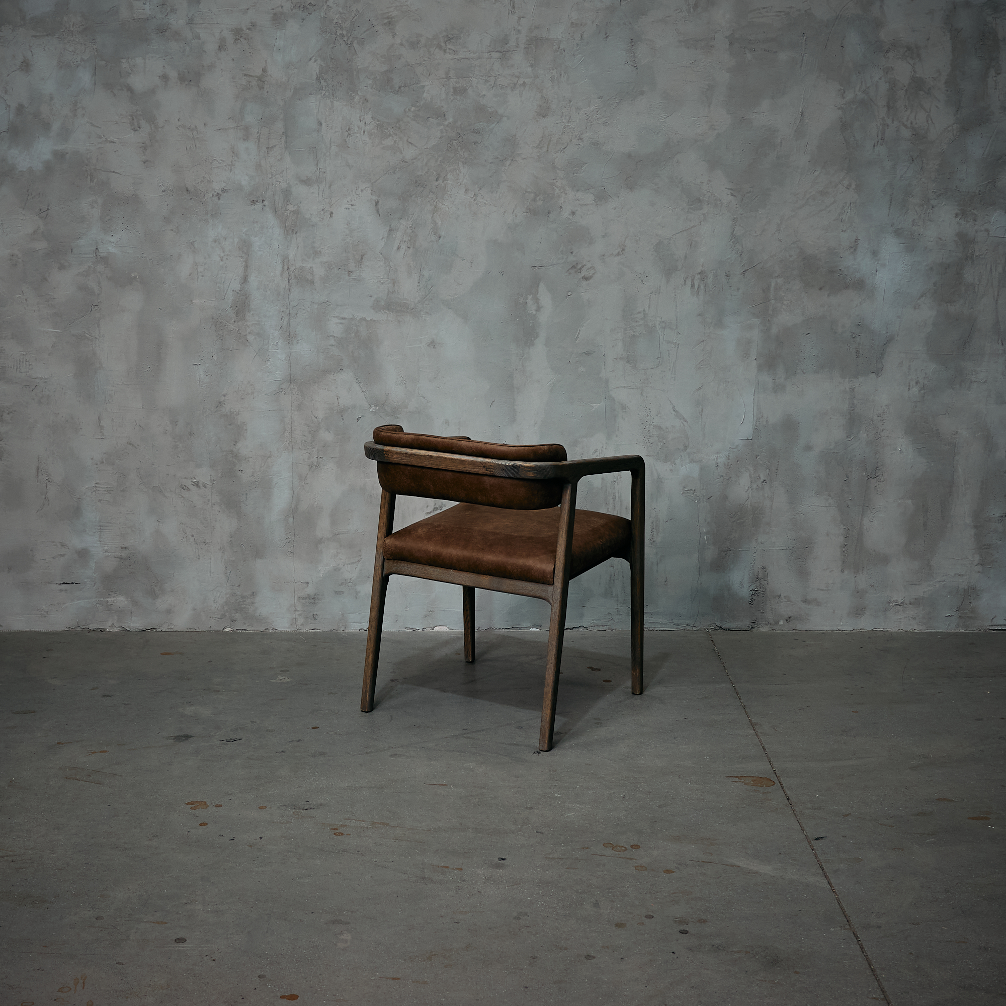Silla fabricada en  madera de fresno en terminación natural y cuero en color café.