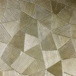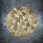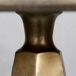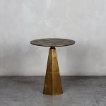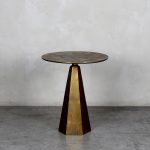 Mesa de fierro color bronce. Base piramide hexagonal y cubierta redonda con texturas ralladas en diferentes sentidos.